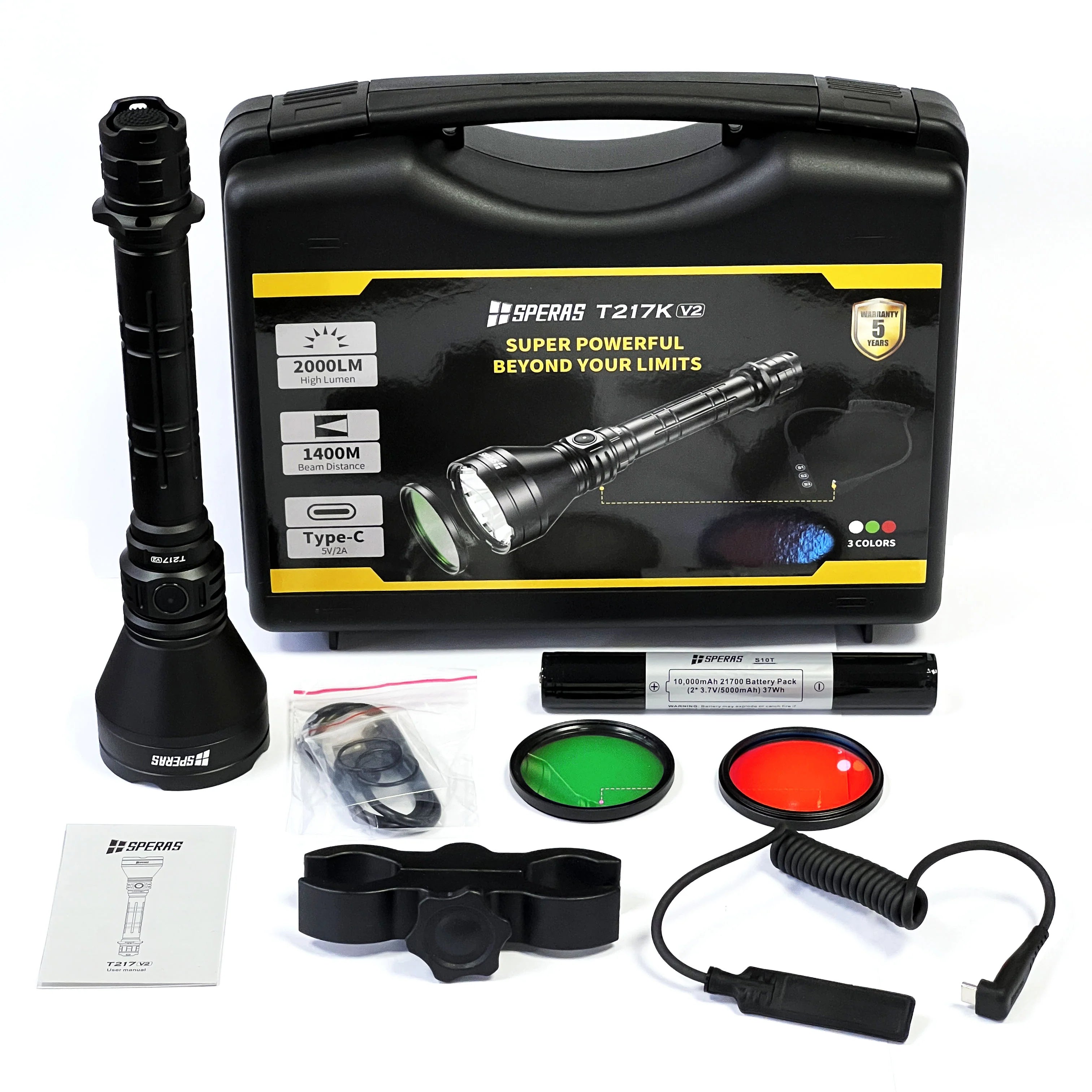 SPERAS T217K V2 on huippuluokan pitkän kantaman taskulamppu, joka on suunniteltu vaativaan käyttöön kuten metsästykseen, etsintäoperaatioihin ja turvallisuustehtäviin. Tämä tehokas valaisin tuottaa 2000 lumenin maksimitehon ja jopa 1400 metrin kantaman, yhdistäen uskomattoman suorituskyvyn ja kestävyyden kompaktissa rungossa.